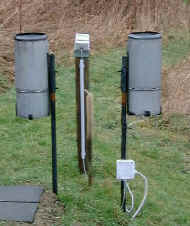 Links der gleiche Regenmesser ohne Wippe für Kontrollmessungen.